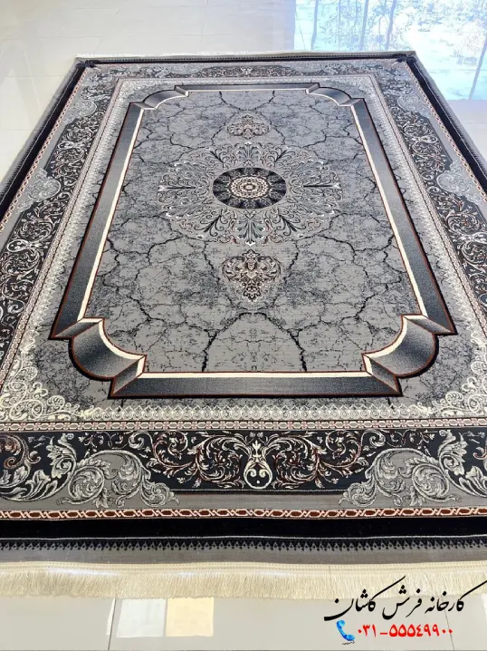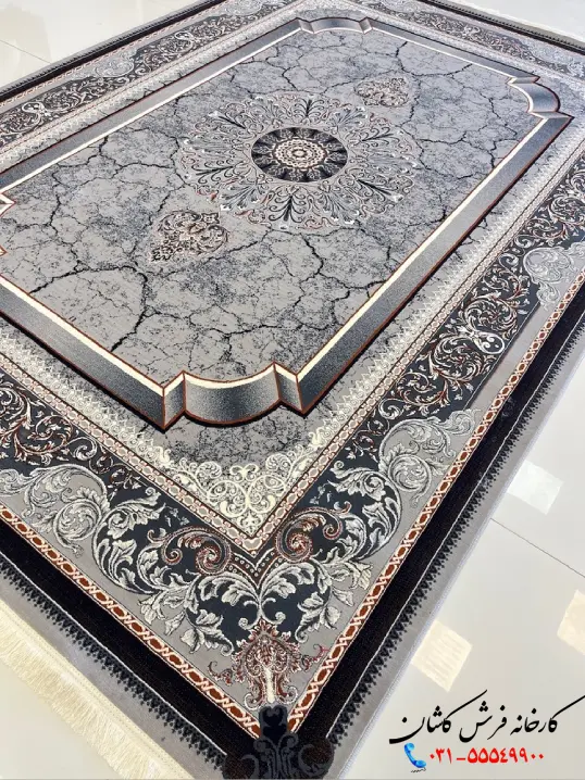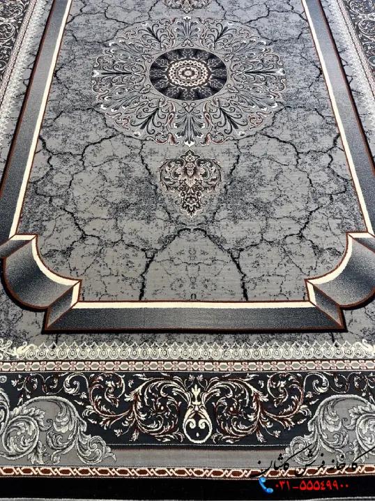 فرش طرح ویهان با رنگ زمینه فرش فیلی، مدلی بسیار خاص و متفاوت است که حالتی مدرن و سنگی دارد. متن اصلی فرش با خطوط نامنظم و تیره‌تر طراحی شده که شباهت زیادی به رگه‌های طبیعی سنگ یا کاشی‌های آنتیک دارد و در مرکز آن، یک ترنج دایره‌ای با جزئیات ظریف قرار گرفته است. قاب‌بندی دور فرش به صورت پله‌ای و برجسته طراحی شده که مرز بین متن و حاشیه را کاملاً مشخص می‌کند و به دلیل استفاده از طیف‌های مختلف خاکستری و دودی، به راحتی با دکوراسیون‌های امروزی و اسپرت هماهنگ می‌شود.
